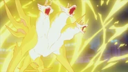 In his giant beastman form, he takes the form of a golden, three-headed wolf when he was powered-up.